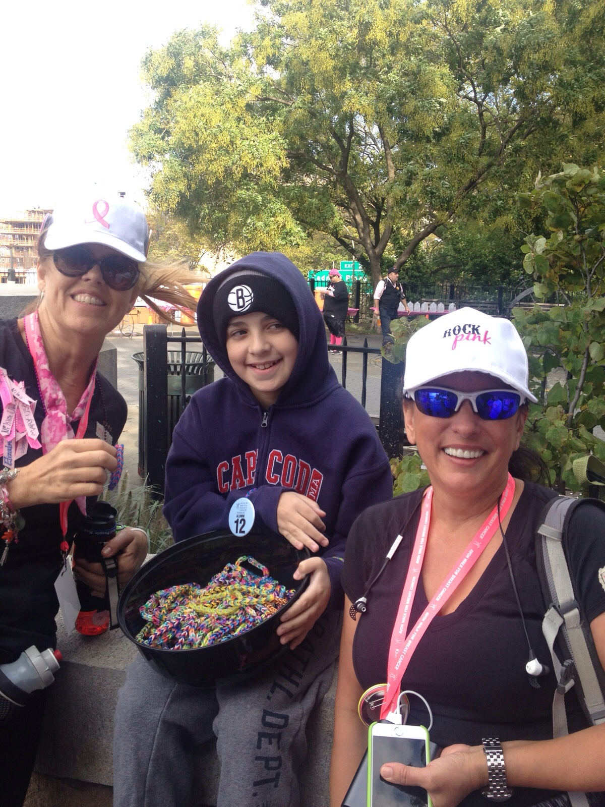 How cool is this? It’s a bowl packed full of 670 handmade rubber band bracelets that are cute and colorful. Everyone lucky enough to pass by gets one as a special gift from Sam. His hands are the ones that made each and every bracelet to thank the walkers who came out to fight the disease that his Mom is battling for her life.